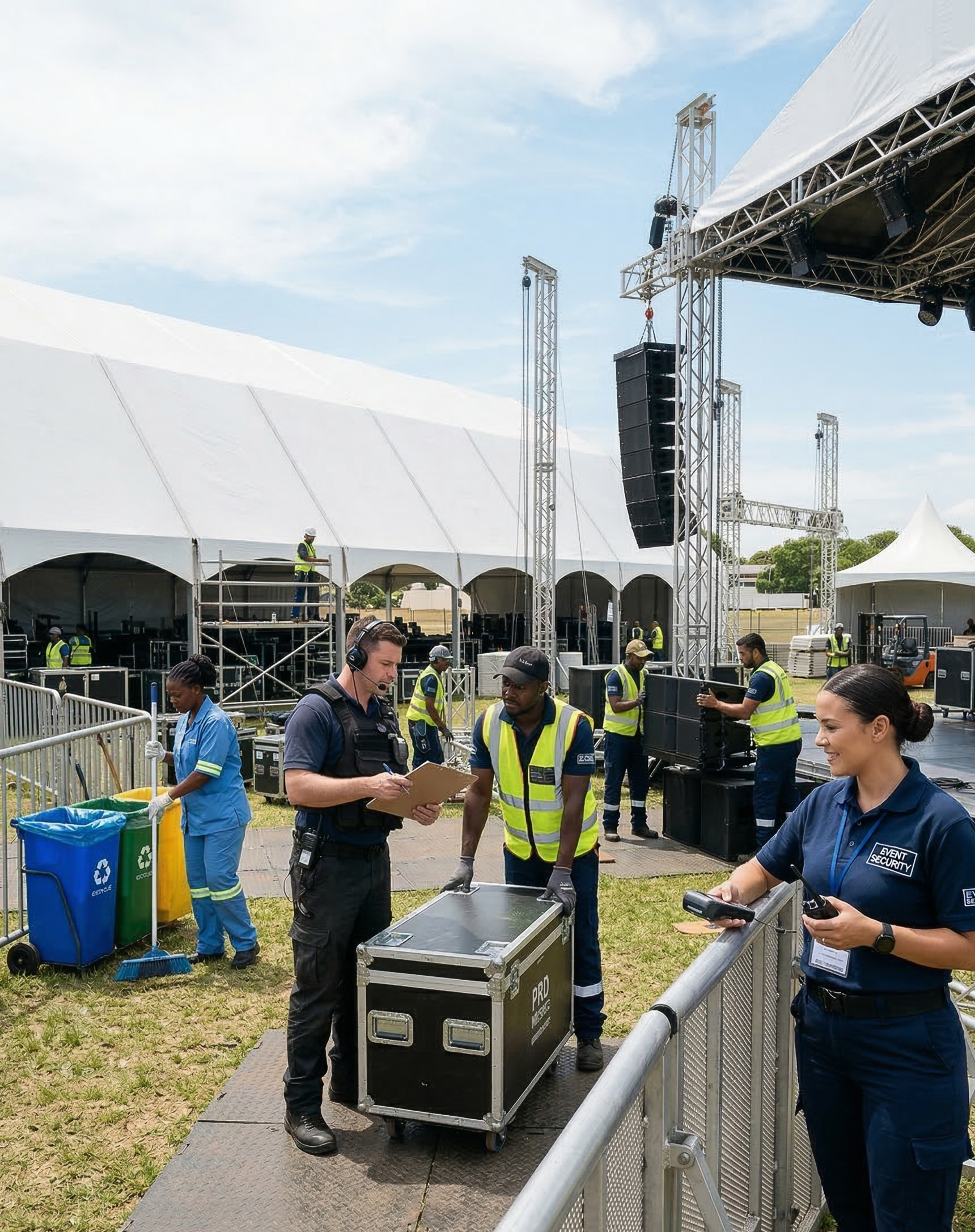Staff, controladores de acesso, carregadores, limpeza e produtores com experiência em eventos.